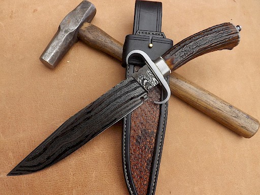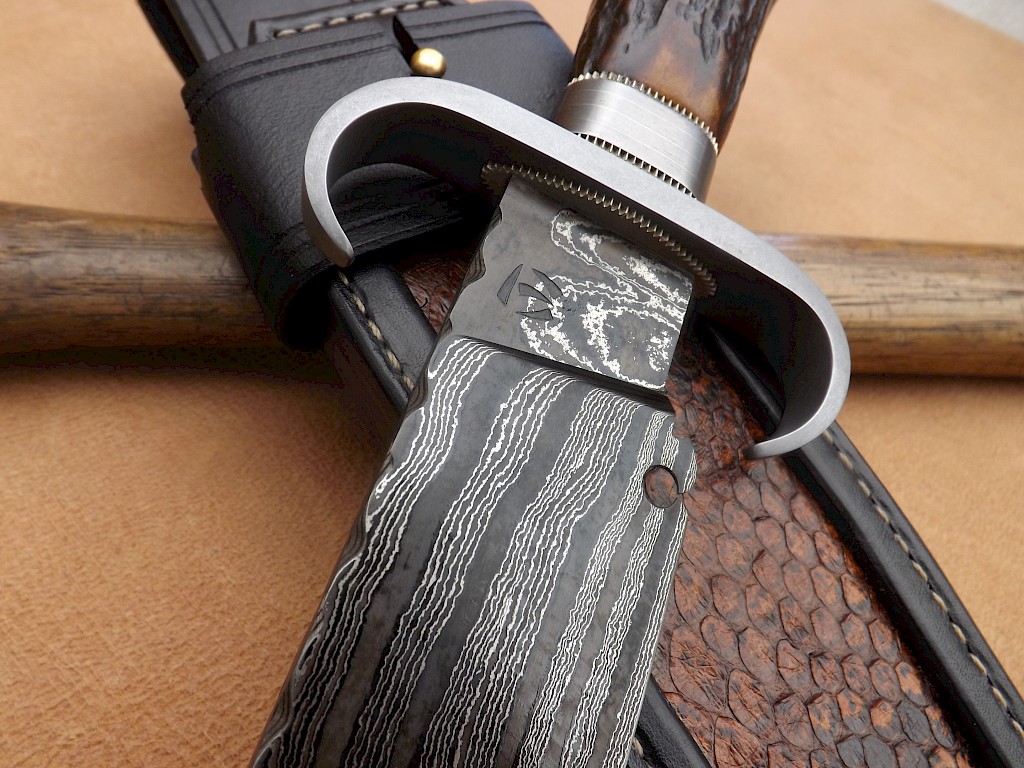 The blade for this Bowie is made from a random pattern Damascus steel. It has a blade length of 236mm, is 49mm wide at the start of the clip, is 6mm thick on the spine and has an overall length of 400mm. The spine has fancy file work running from the ricasso to the start of the false clip and the Damascus blade is made from 220 layers of 1075, 15N20 and pure nickel. The blade has been dipped in ferric chloride to bring out the Damascus… View More