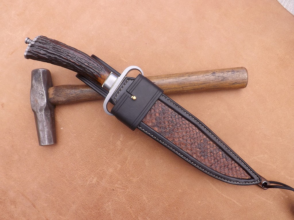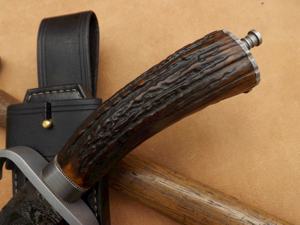 This hunting/camping knife has a blade made from W-1 high carbon tool steel. The blade has had clay applied before hardening to bring out a beautiful Hamon in the steel. The blade length is around 140mm, blade thickness on the spine is just over 5mm and the overall length of the knife including its finial nut on the handle is around 260mm. The carbon steel single branch handguard, butt cap and finial nut have all been gun blued. The carbon… View More