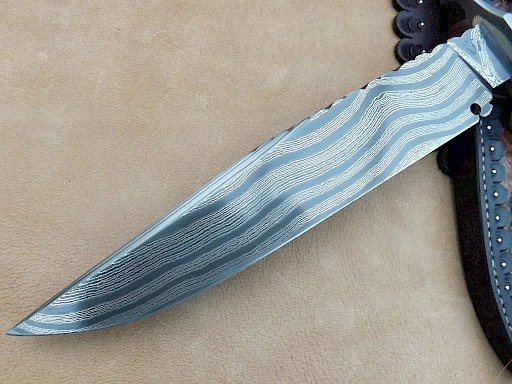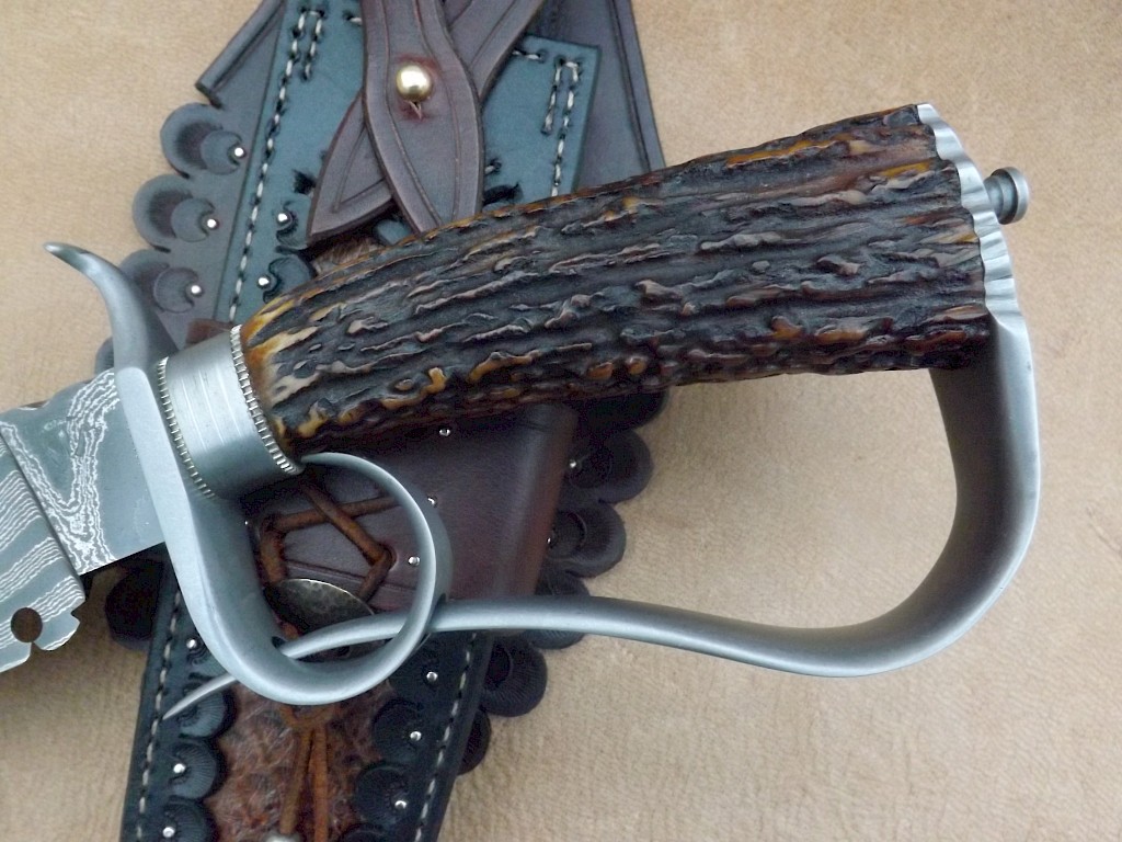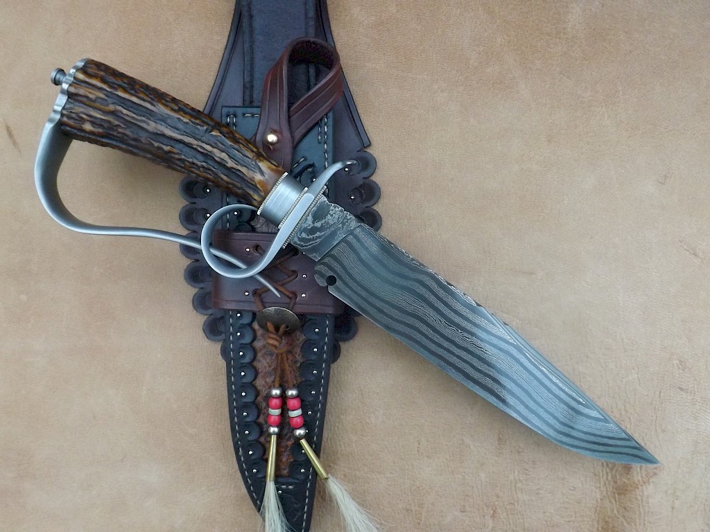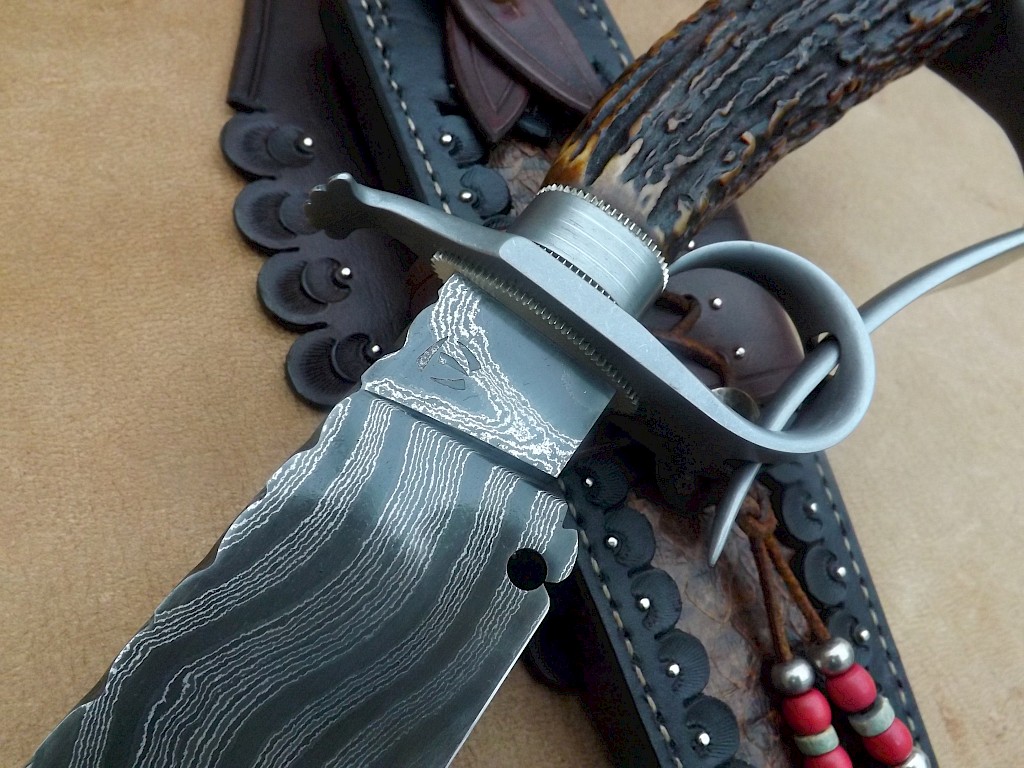 The blade for this Bowie is made from 220 layers of 1080 high carbon tool steel, 15N20 and pure nickel. The blade length is 260mm and is 5mm thick on the spine. The spine is decorated with fancy file work and the heel of the blade sports a Spanish notch. The overall length of the knife is 415mm including the finial nut. The handle contains three coined nickel silver spacers. The handguard has a clam shell filed into the top and is inspired by the David Lisch style pierced ring D-guard. The butt cap, finial nut and the pierced ring D-guard have been acid etched and stone washed and the butt cap section has been filed to match the flutes in the antler. The bolster is made from four pieces of wrought iron forge welded together with three layers of pure nickel. The handle is a piece of Sambar stag which has been dyed walnut brown. The hand stitched leather sheath is a double welted Mexican belt loop style, with hand applied tooling, dyed mahogany brown with a black leather frame surrounding a python skin inlay with small silver rivet accents and horse hair filled brass cones hanging from the frog section of the sheath. There is one brass Sam Brown stud with a leather keeper to keep the knife safely in its sheath.